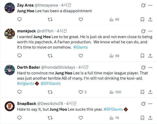 이 같은 반응은 단순한 한 경기 결과가 아닌, 시즌 초반 누적된 부진에 대한 불만이 반영된 것으로 보인다. 실제로 샌프란시스코 타선은 개막 이후 극심한 득점력 부족에 시달렸고, 중심 타선에서 기대를 받는 이정후 역시 아직 확실한 존재감을 보여주지 못하고 있다.