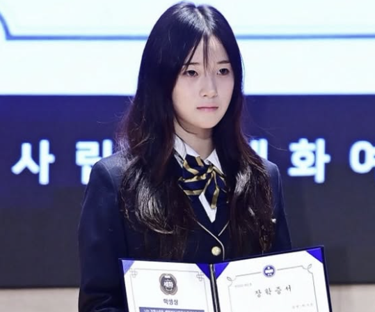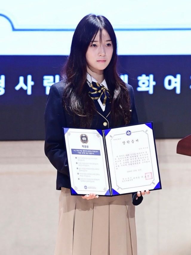 공개된 사진 속 최가온은 정갈한 교복 차림으로 단상에 올라 장학 증서와 1000만원의 장학금 액수가 적힌 판넬을 들었다.